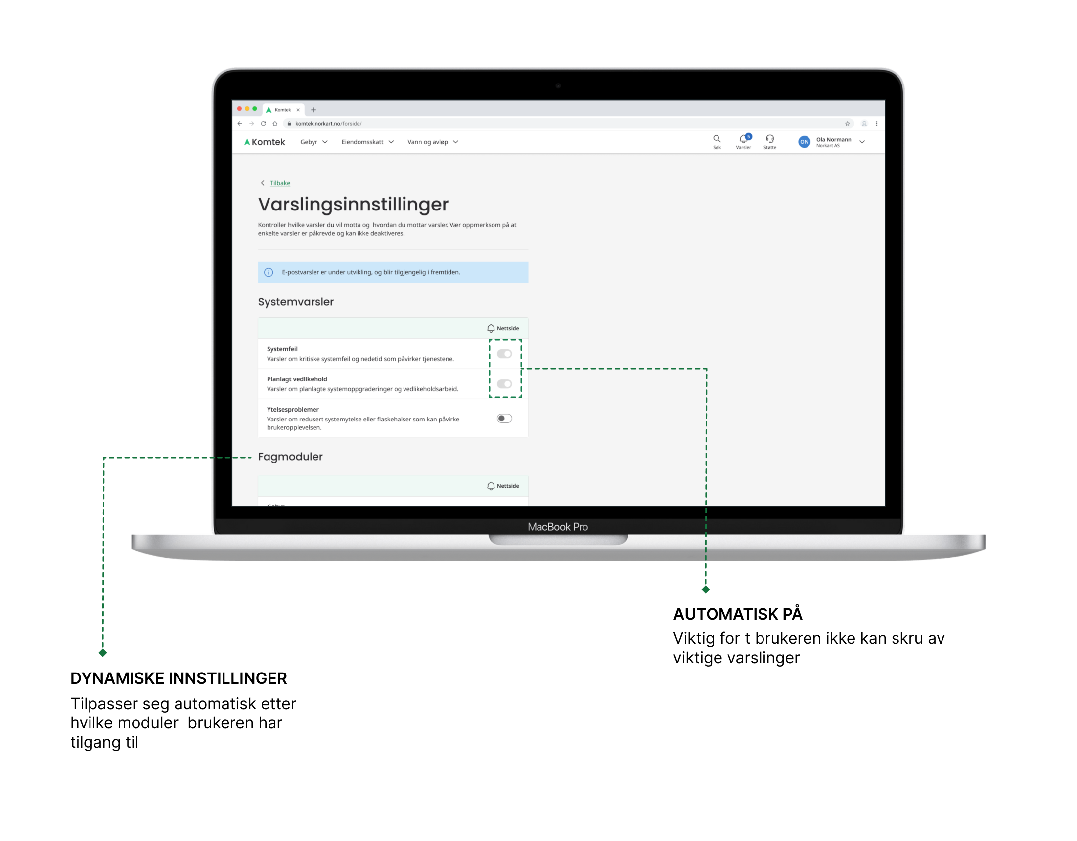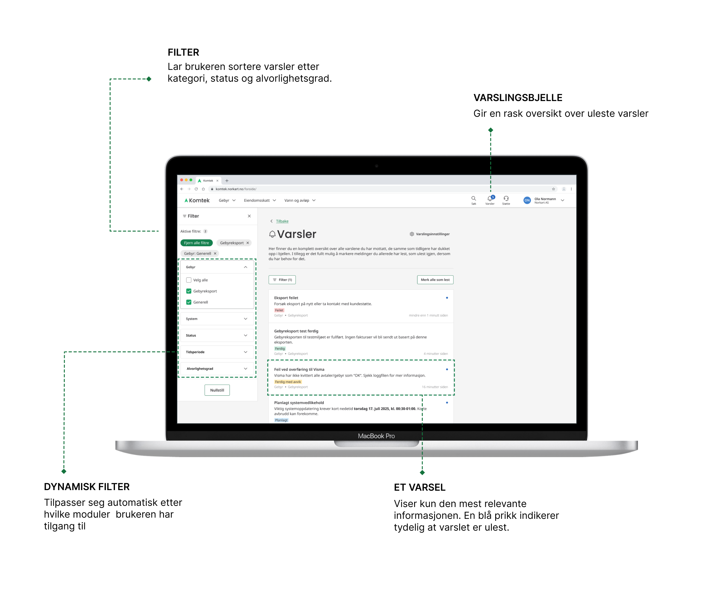 Designet inkluderte et sentralt varslingssenter som samlet alle varsler på ett sted, med fokus på tydelighet, universell utforming og enkel navigasjon. Vi tok i bruk visuelle hierarkier, fargebruk og interaktive elementer for å sikre rask forståelse og effektiv bruk.